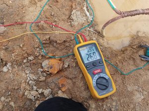 Pengukuran tahanan pembumian (grounding resistance) menggunakan alat ukur terkalibrasi.